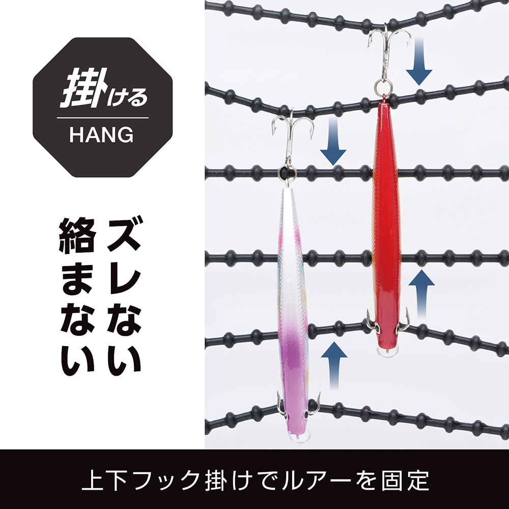 ●伸縮するシリコーンハングにルアーを張った状態で掛けるので、ルアー同士が動いて針が絡まる等のトラブルを防ぎます。