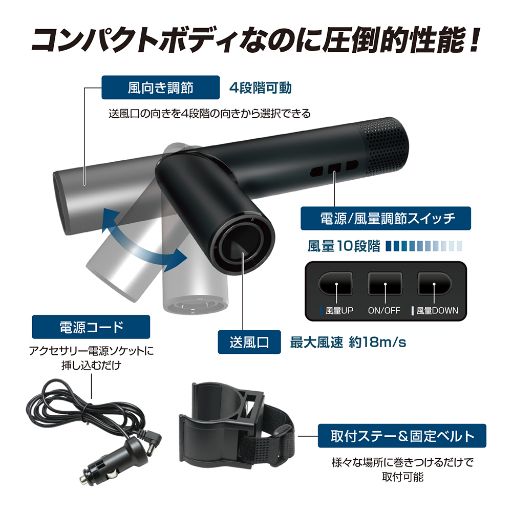 ●ヘッドレストやアシストグリップに取り付ける強力スポット扇風機です。