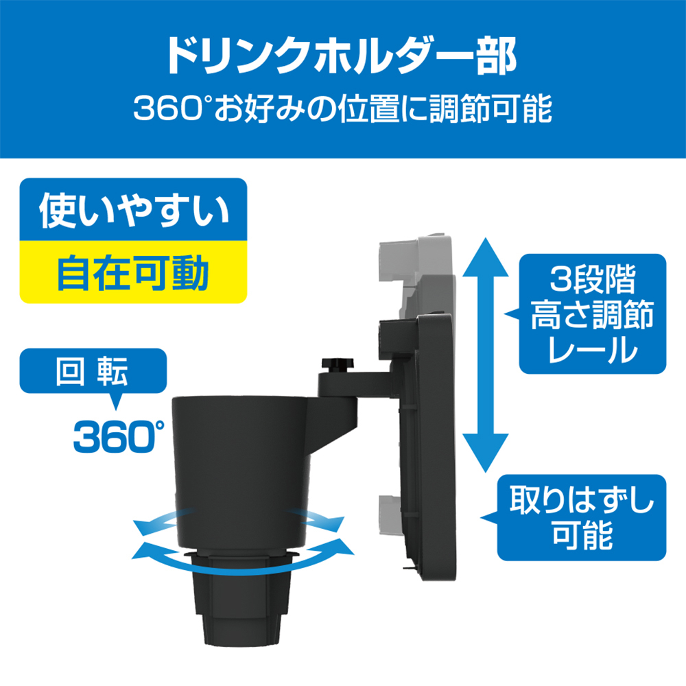 ●純正カップホルダーにしっかりと取り付けできる3点ストラット構造を採用しています。