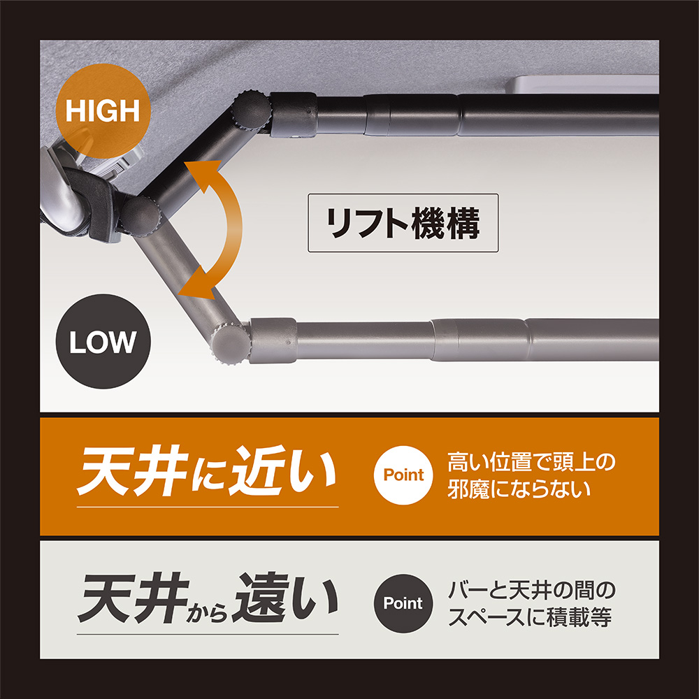 ●バーと天井との距離を近付けたり広げたりできる、高さ調節可能なリフト機構付きバーです